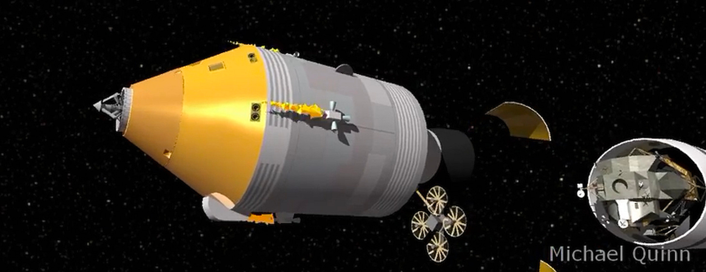 The solution they arrived at seemed to violate every principle of simplicity and directness. Instead of making the problem simpler, they appeared to make it more complex. The command and service module would separate from the adapter housing the lunar module, fire thrusters to move away, perform a 180-degree rotation, essentially flipping around completely, and then carefully approach the now-exposed lunar module to dock nose-to-nose.